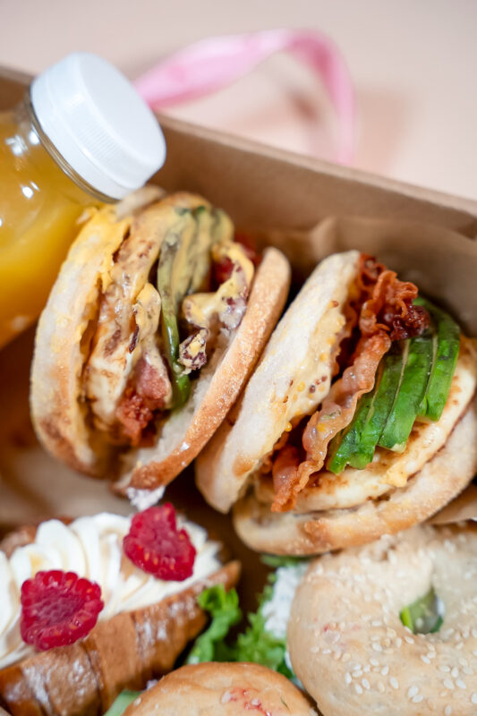 - 2 × muffin angielski z jajkiem sadzonym, chrupiącym boczkiem oraz plastrami awokado.