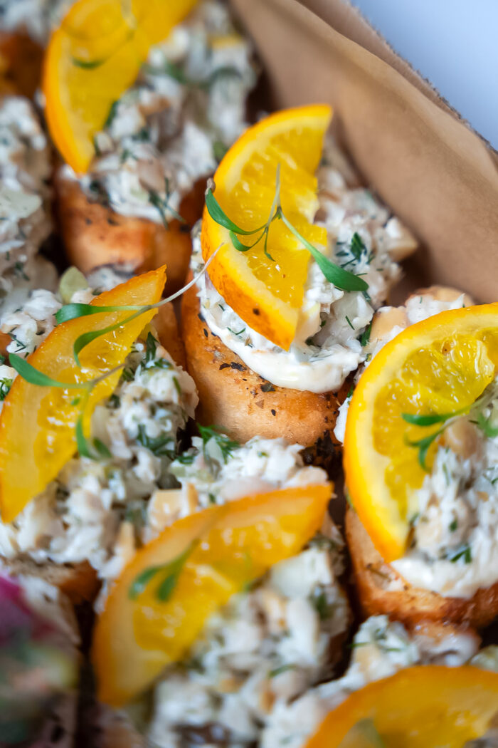 Mini grzanka z tatarem z pstrąga i kandyzowaną pomarańczą