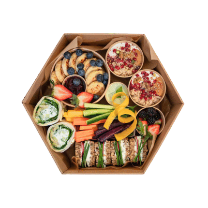 Box śniadanie wegańskie dostarczamy cały tydzień. Na zdjęciu prezentujemy Box śniadanie wegańskie zawierający poczęstunek dla 3 osób.