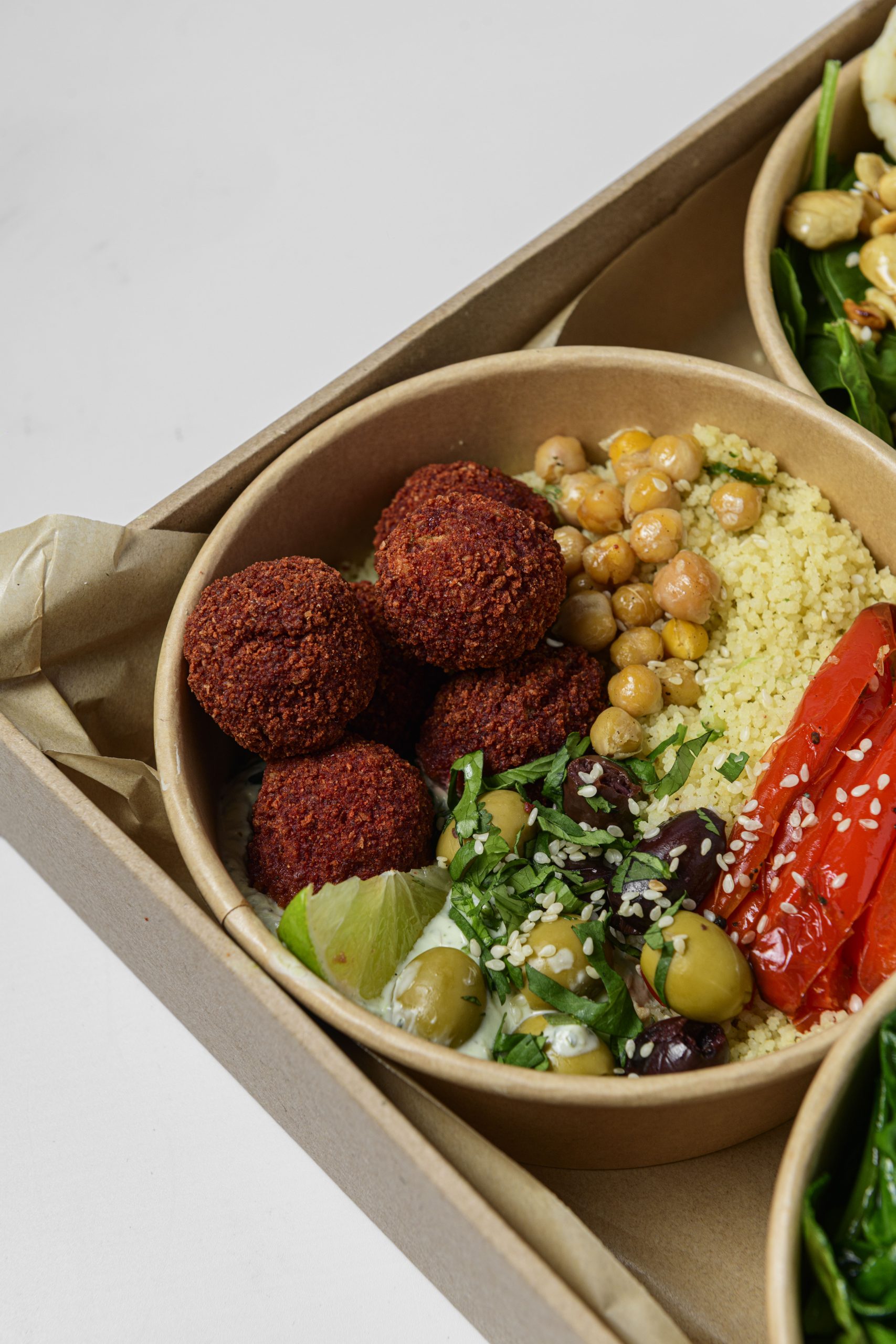 - 1x Bowl z hummusem (grillowana ciecierzyca, kuskus, oliwki, sos miętowy, falafel buraczany, papryka czerwona)