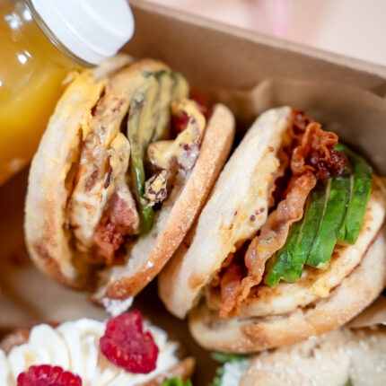 - 2 × muffin angielski z jajkiem sadzonym, chrupiącym boczkiem oraz plastrami awokado.