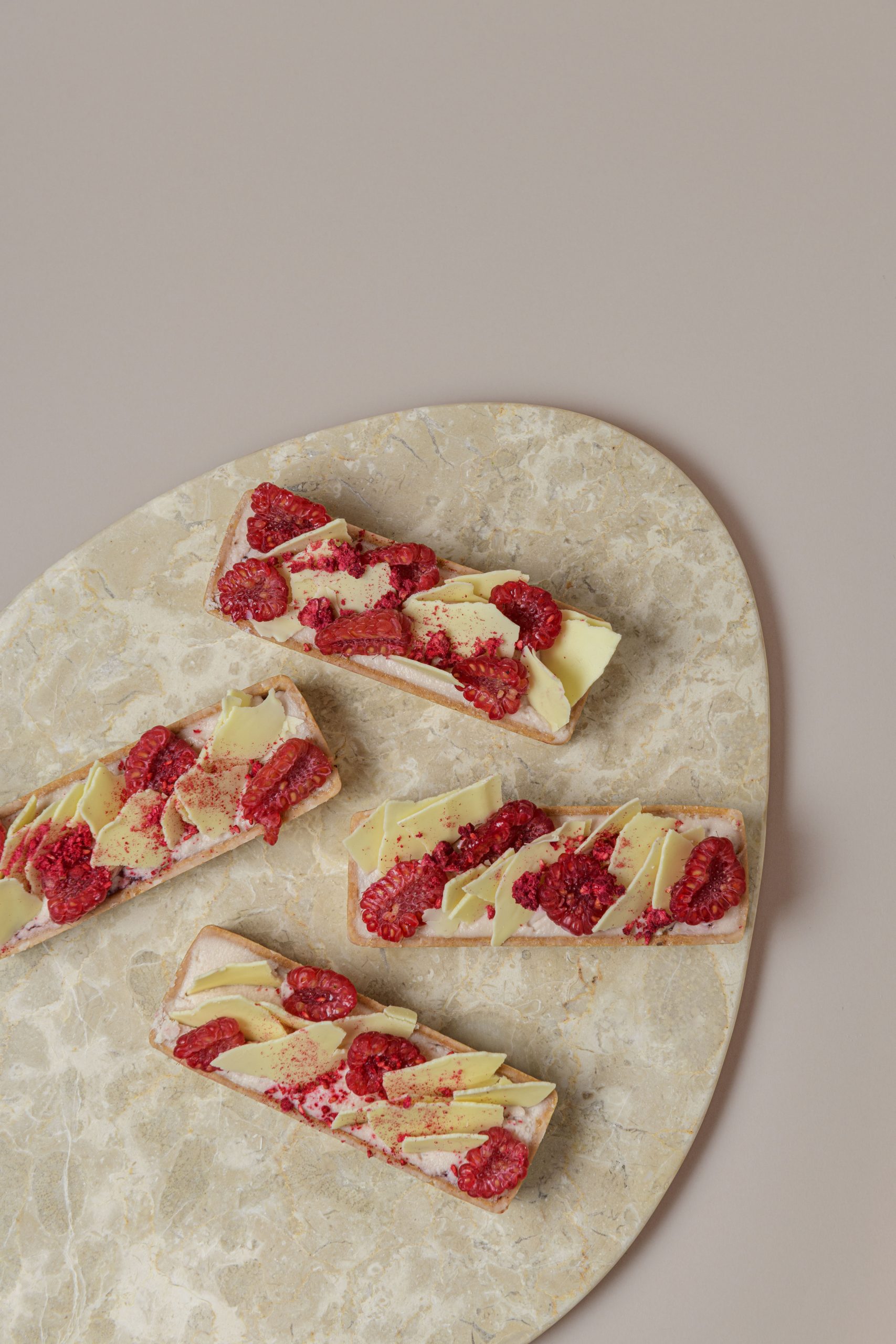 - 2x korpus podłużny z z kremem truskawkowym, musem malinowym, płatkami białej czekolady i świeżą maliną
