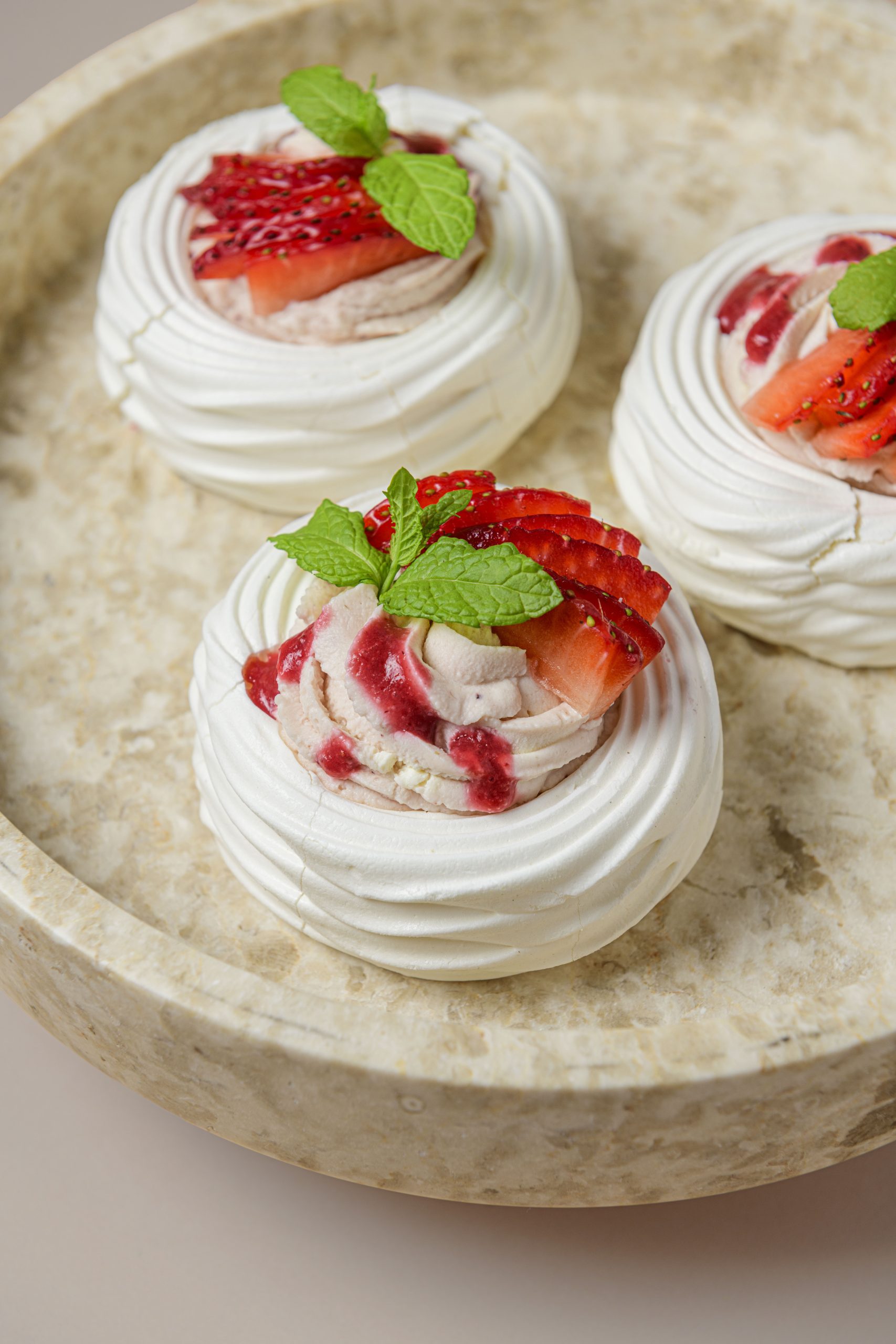 - 3x mini beza Pavlova z kremem truskawkowym na bazie mascarpone, świeżymi truskawkami, sosem malinowym i mięta
