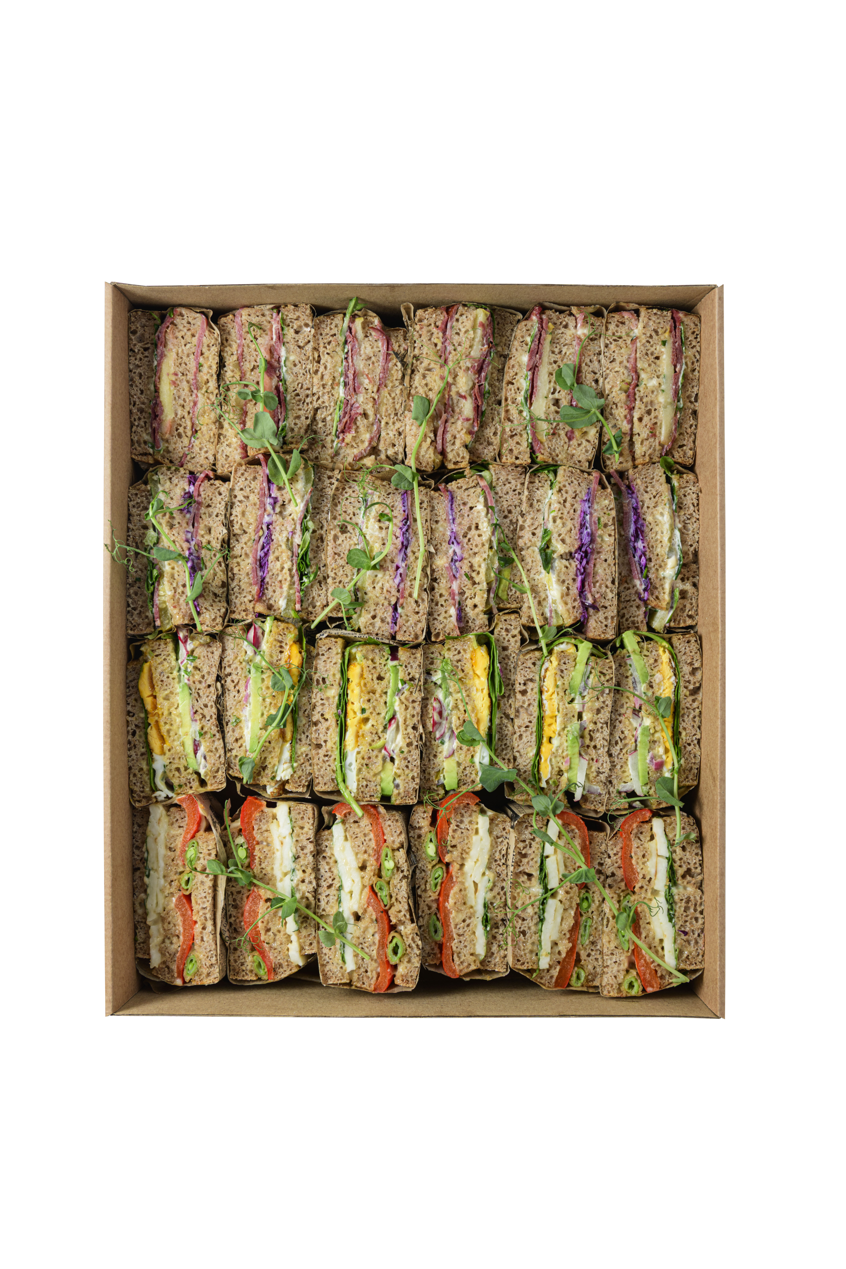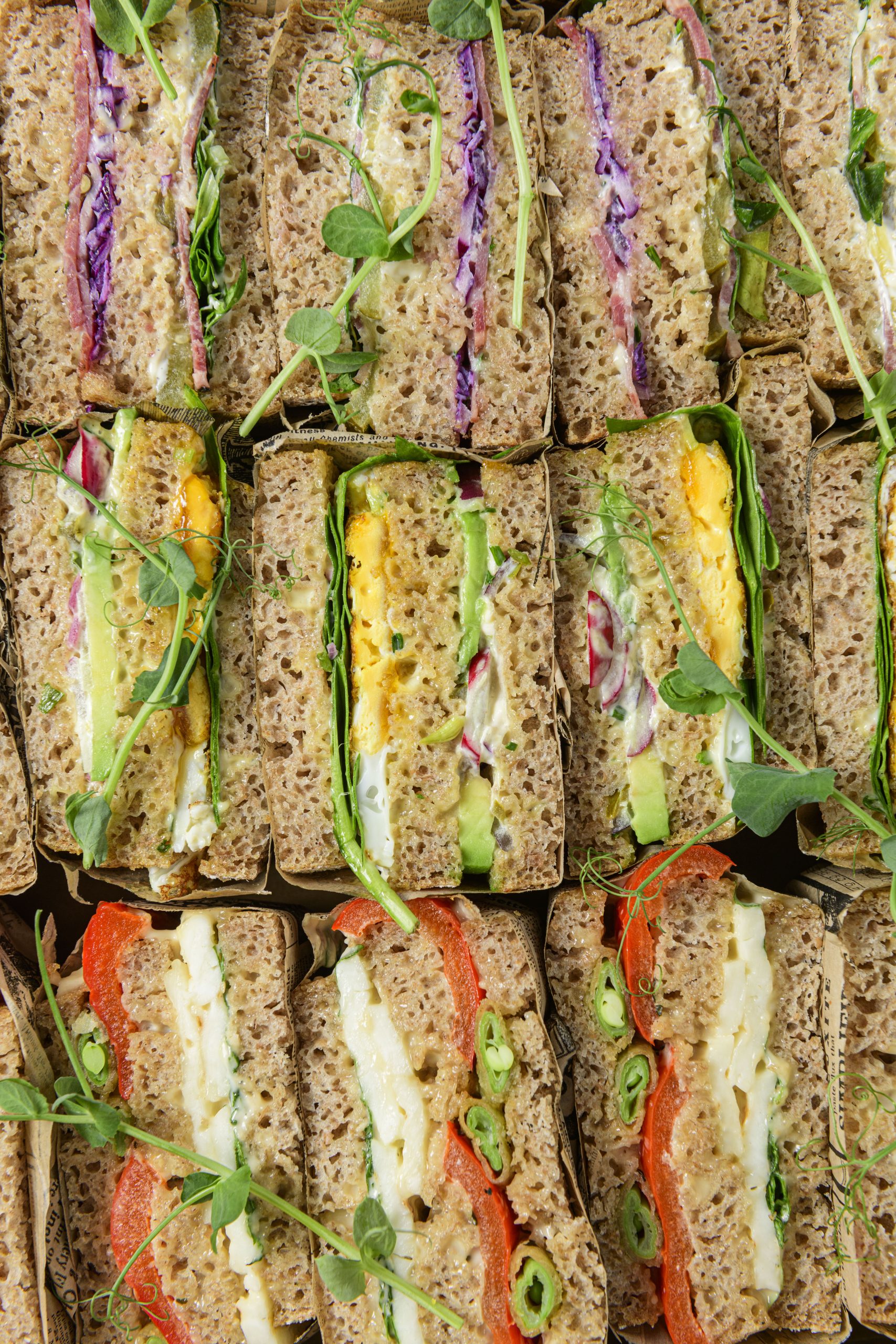 - 6x Sandwich z jajkiem sadzonym, majonezem szczypiorkowym z piklowaną czerwoną cebulką, awokado, ogórekiem, rzodkiewką i roszponką