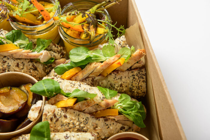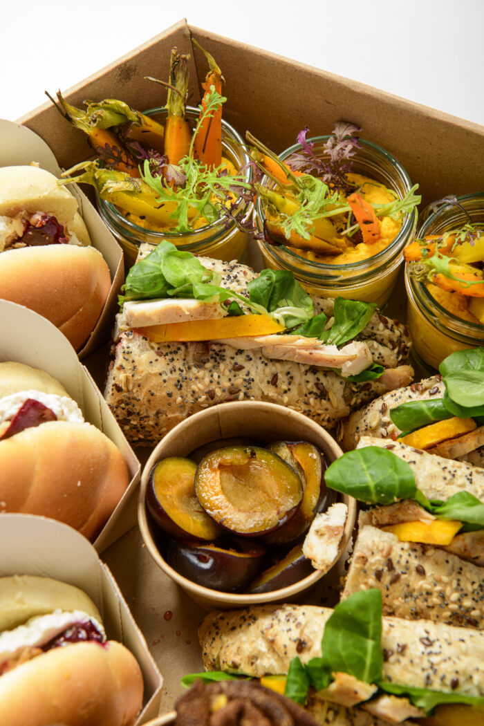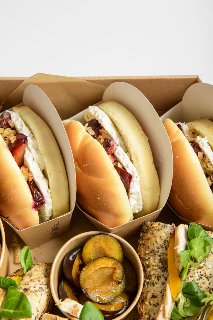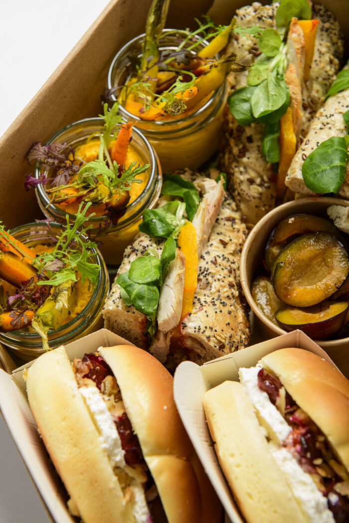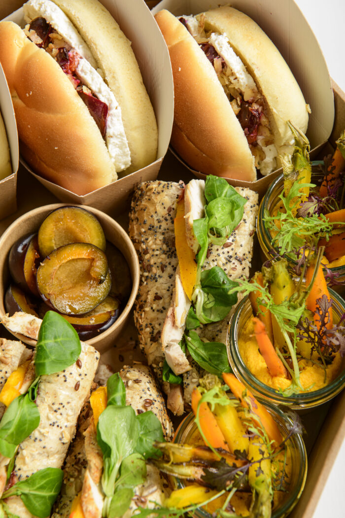 Rogal wieloziarnisty z chutney śliwkowym, grillowanym indykiem w miodzie i rozmarynie, fetą, plastrami pieczonej dyni i roszponką